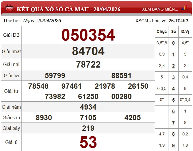 Kết quả xổ số Cà Mau ngày 20/4/2026