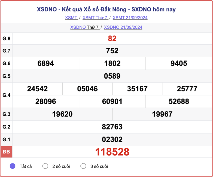 XSDNO 28/9. Kết quả xổ số Đắk Nông hôm nay - XSDNO thứ Bảy ngày 28/9/2024 sẽ được cập nhật nhanh chóng và chính xác nhất trên phuongtruongan.vn. Kết quả các giải thưởng XSDNO ngày 28/9/2024 sẽ được cập nhật liên tục từ giải nhất cho đến giải tám, cuối cùng là giải đặc biệt.