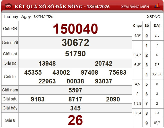 Theo dõi ngay kết quả xổ số Đăk Nông hôm nay 18/4/2026 nhanh chóng và chính xác nhất.