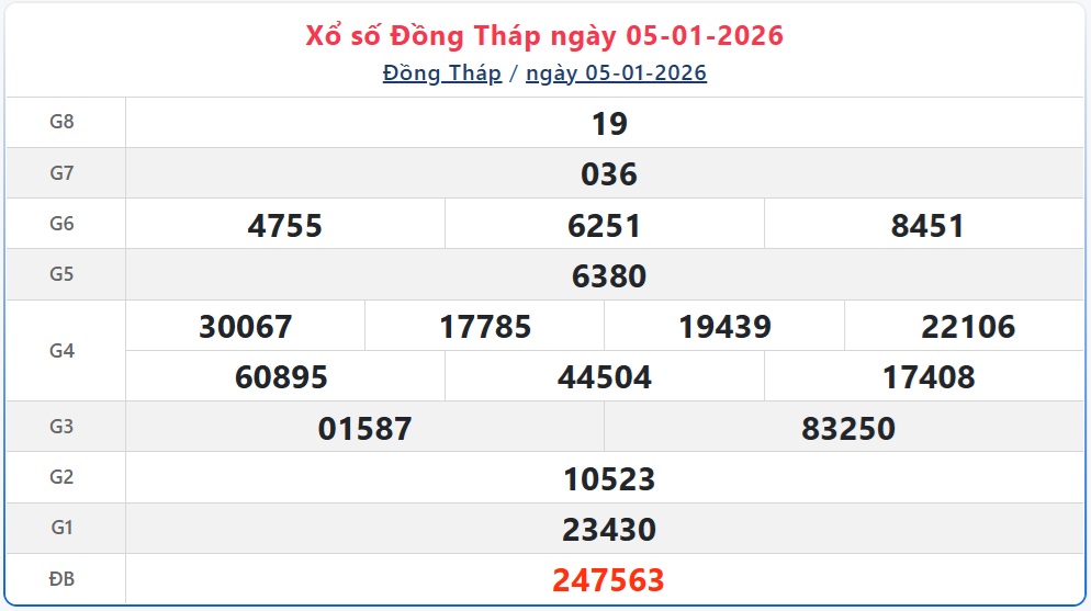 Kết quả xổ số Đồng Tháp thứ Hai ngày 5/1/2026