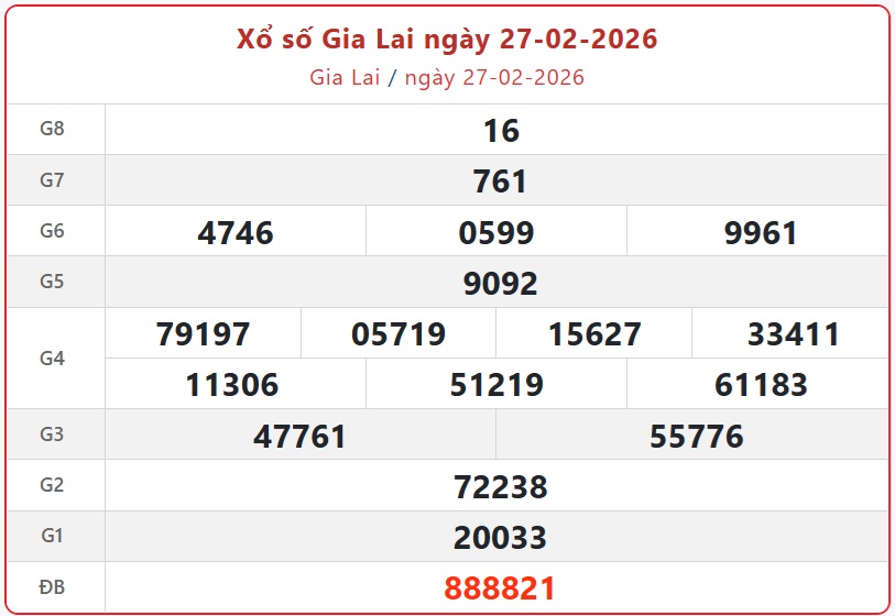 Kết quả xổ số Gia Lai ngày 27/2/2026