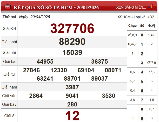 Kết quả xổ số Hồ Chí Minh ngày 20/4/2026
