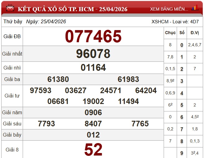 Kết quả xổ số Hồ Chí Minh ngày 25/4/2026