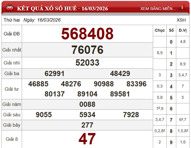 Kết quả xổ số Huế ngày 16/3/2026