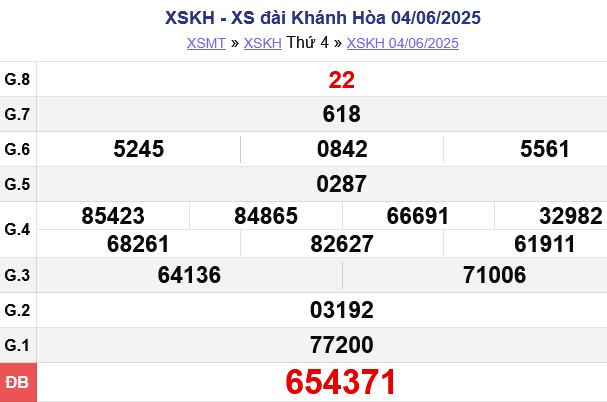 XSKH 18/6. Kết quả xổ số Khánh Hòa hôm nay 18/6/2025 được quay thưởng vào lúc 17h15 bởi Công ty TNHH MTV Xổ số kiến thiết Khánh Hòa. Kết quả các giải thưởng XSKH 18/6/2025 được công bố lần lượt từ giải nhất cho đến giải tám, cuối cùng là giải đặc biệt.
