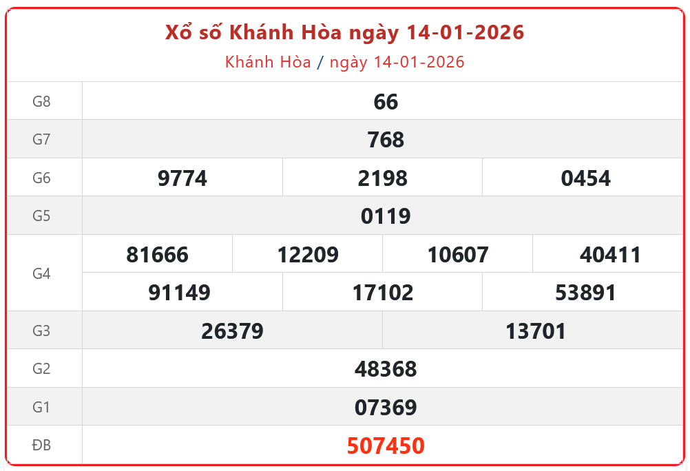 XSKH 14/1. Kết quả xổ số Khánh Hòa hôm nay 14/1/2026 được quay thưởng vào lúc 17h15 bởi Công ty TNHH MTV Xổ số kiến thiết Khánh Hòa. Kết quả các giải thưởng XSKH 14/1/2026 được công bố lần lượt từ giải nhất cho đến giải tám, cuối cùng là giải đặc biệt.