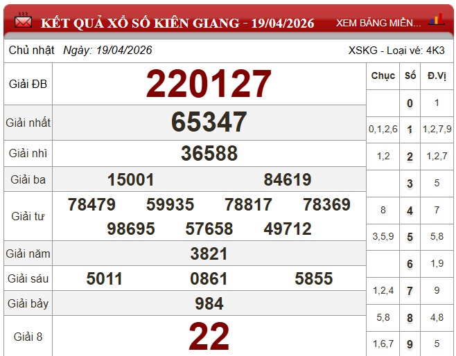 Kết quả xổ số Kiên Giang ngày 19/4/2026