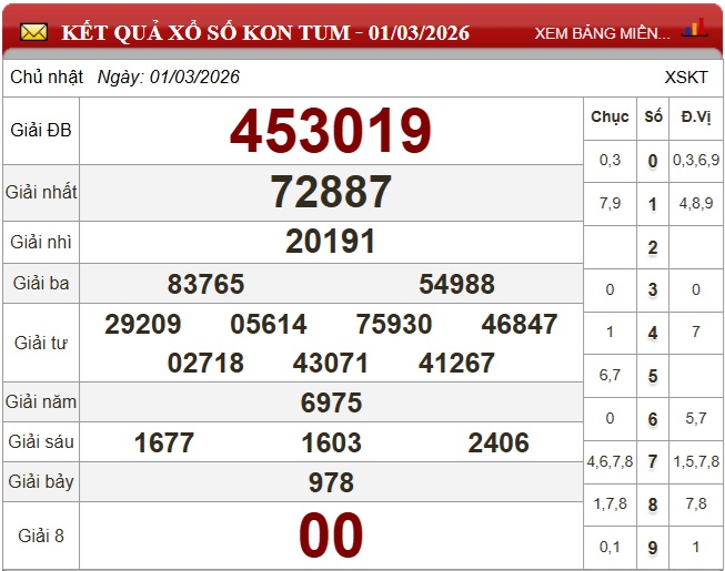 Kết quả xổ số Kon Tum ngày 1/3/2026