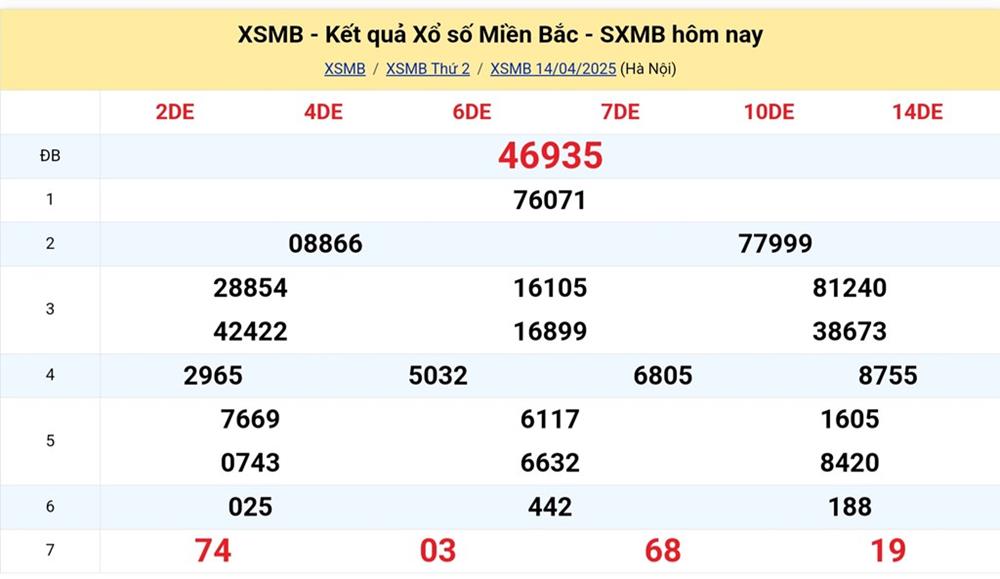 XSMB 14/4, kết quả xổ số miền Bắc ngày 14/4/2025.