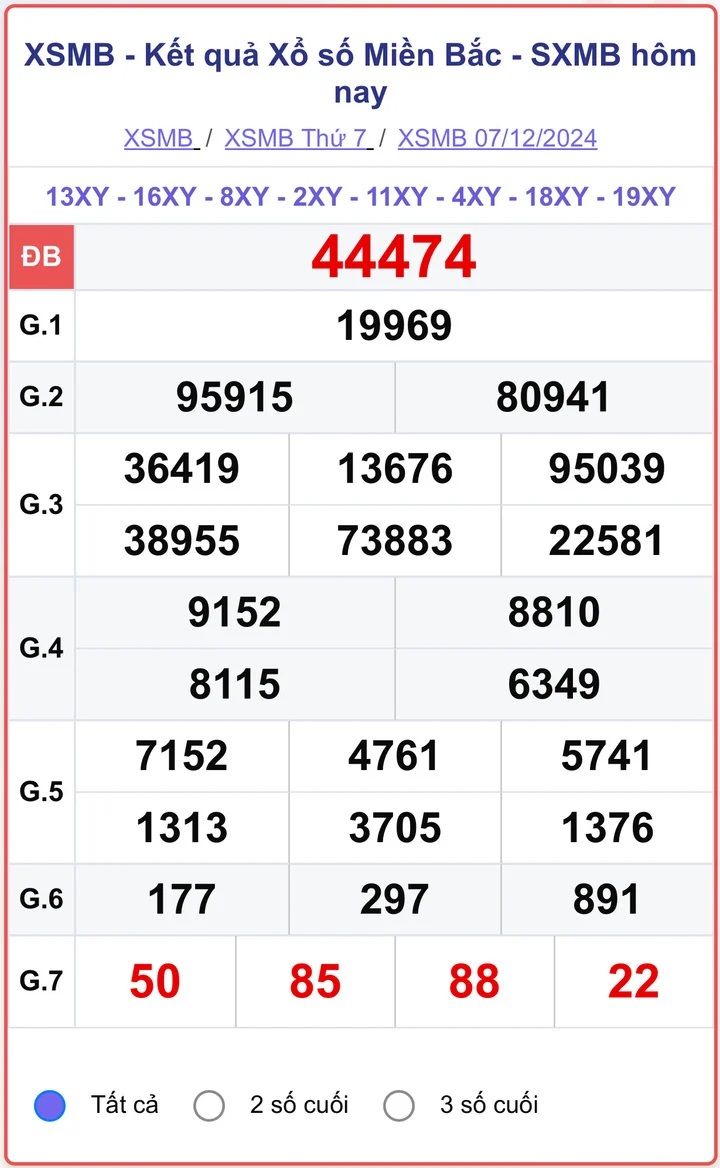 XSMB 11/12. Kết quả xổ số miền Bắc hôm nay - XSMB thứ Tư ngày 11/12/2024 được quay vào lúc 18h15, bởi Công ty xổ số kiến thiết Bắc Ninh. Kết quả các giải thưởng của XSMB ngày 11/12/2024 sẽ được công bố lần lượt từ giải nhất đến giải bảy, cuối cùng là giải đặc biệt.