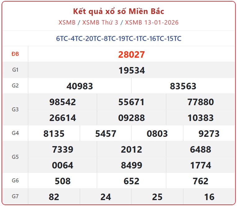 Kết quả Xổ số miền Bắc ngày 13/1/2026