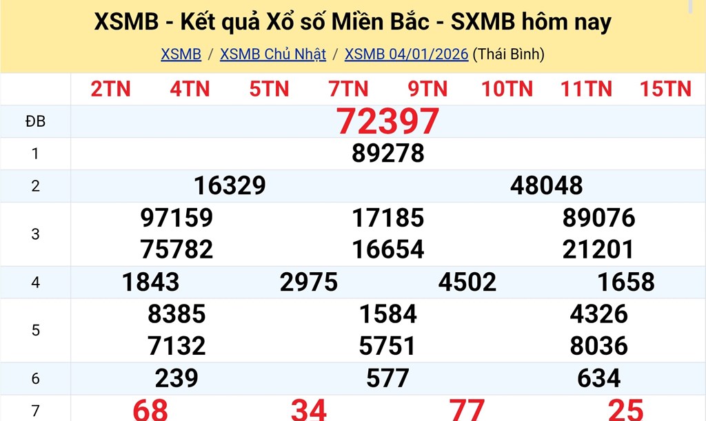 Kết quả xổ số miền Bắc ngày 4/1/2026. KQXSMB 4/1