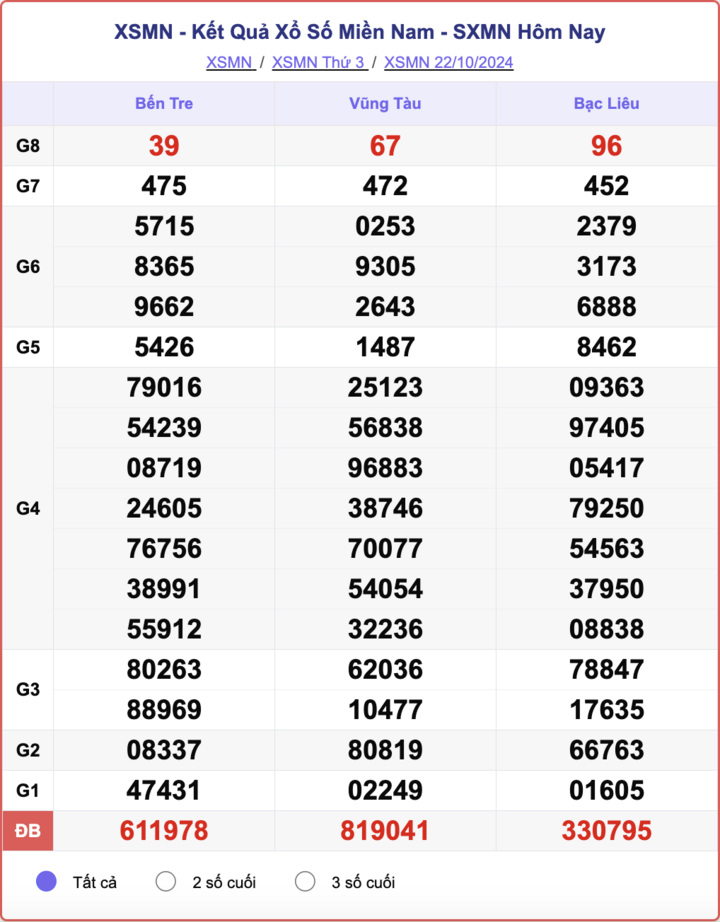 - Thứ 3 hàng tuần xổ số miền Nam được quay thưởng tại Bạc Liêu, Bến Tre, Vũng Tàu.