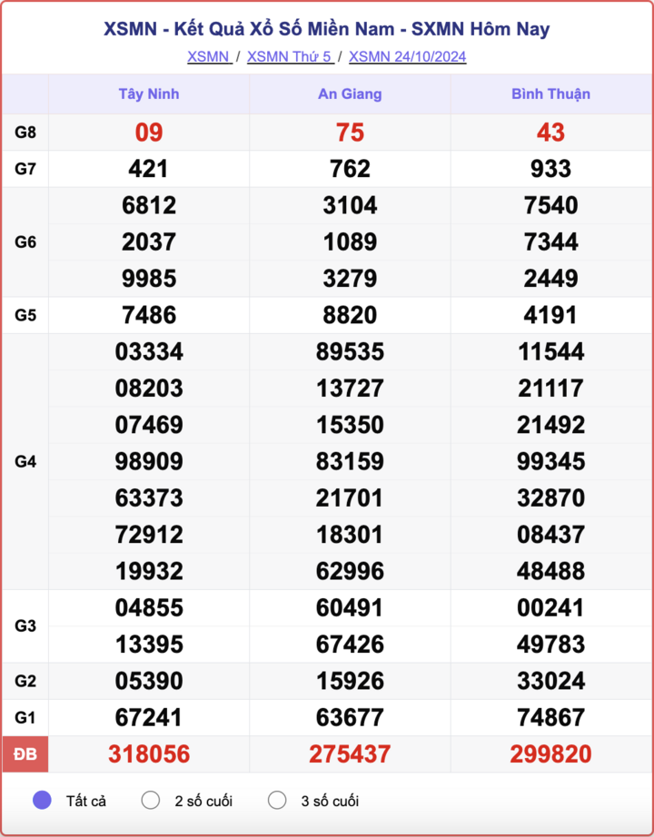XSMN 24/10, kết quả xổ số miền Nam hôm nay 24/10/2024.