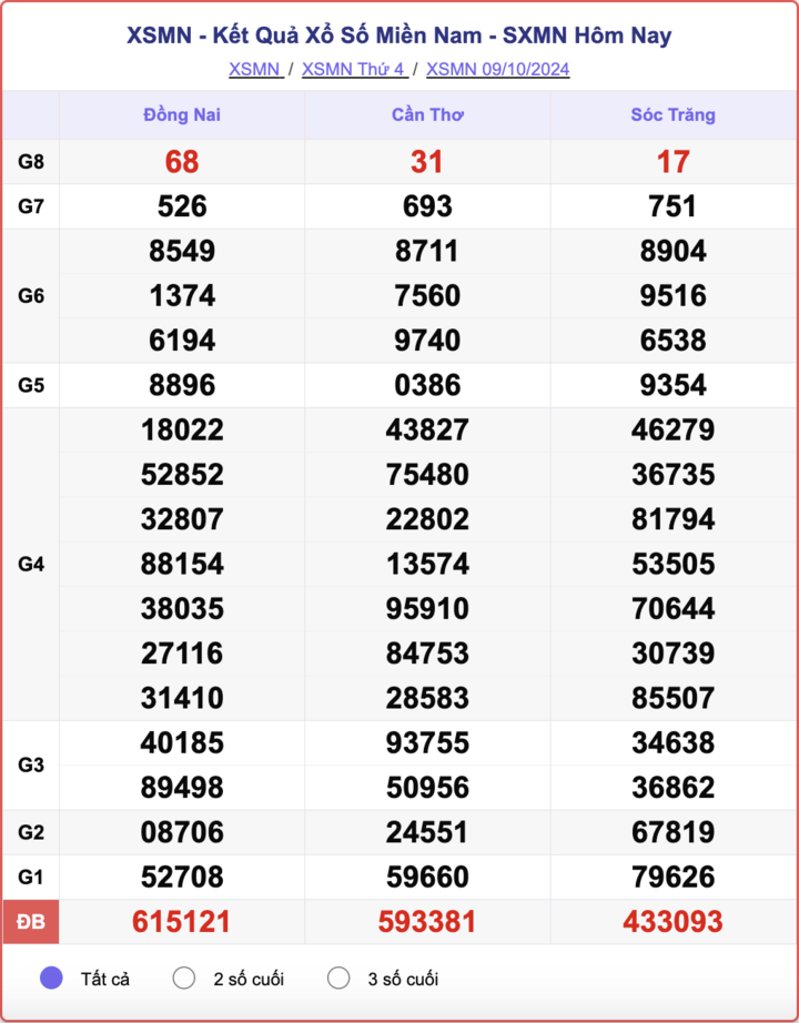 Kết quả xổ số miền Nam hôm nay - XSMN 13/10 - XSMN Chủ nhật ngày 13/10/2024 sẽ được cập nhật trực tiếp trên LDG. Kết quả các giải thưởng của XSMN ngày 13/10/2024 được công bố lần lượt từ giải nhất cho đến giải tám, cuối cùng là giải đặc biệt.