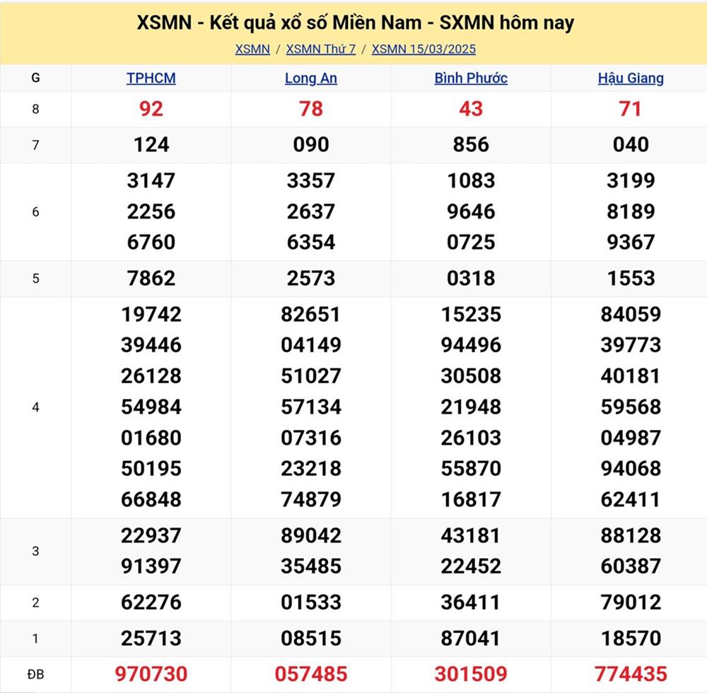XSMN 15/3, kết quả xổ số miền Nam ngày 15/3/2025.