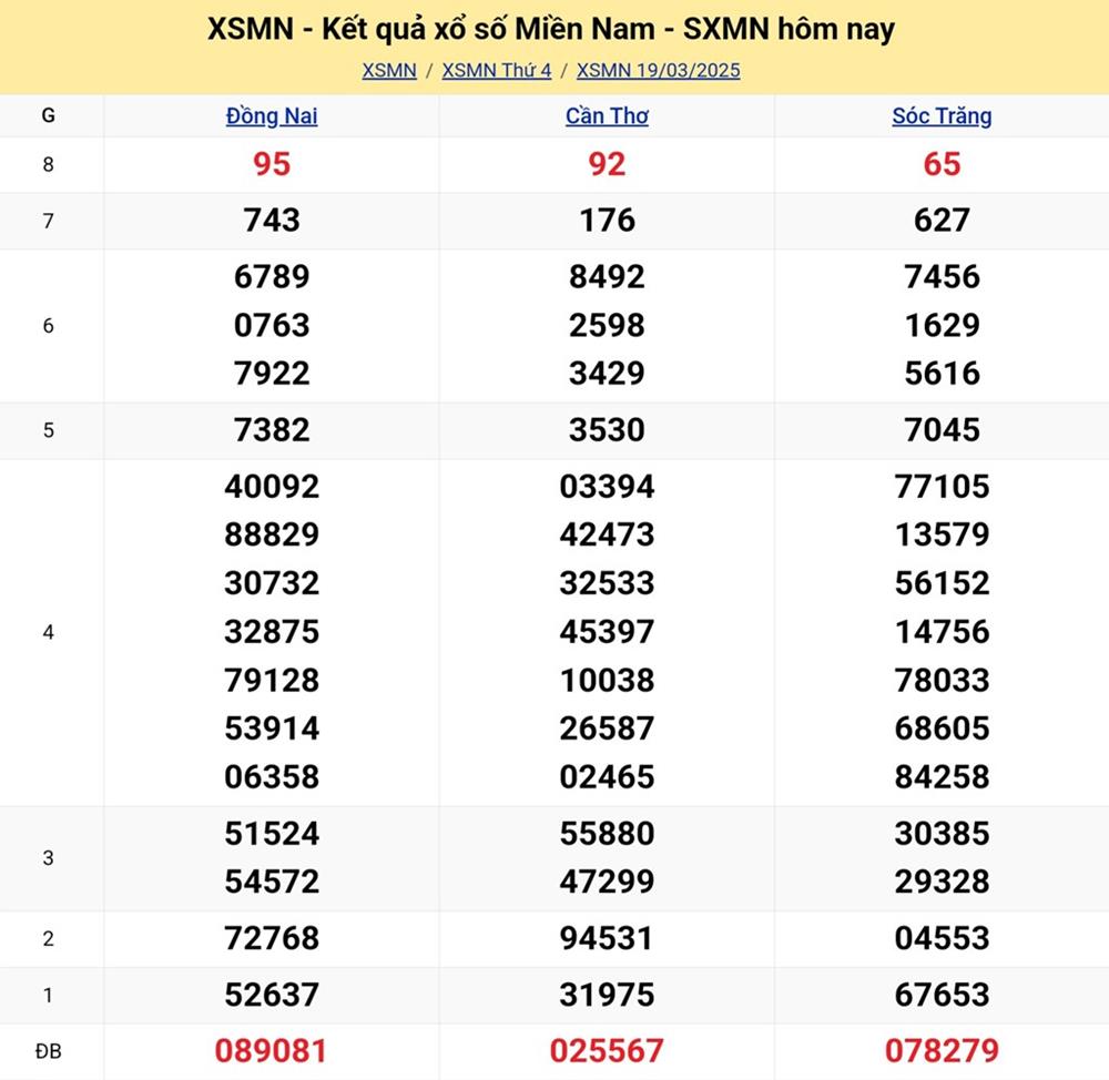 Kết quả xổ số miền Nam (XSMN) được thực hiện lúc 16 giờ 30 phút và được mở thưởng bởi Công ty xổ số kiến thiết Đồng Nai (XSĐN), Sóc Trăng (XSST), Cần Thơ (XSCT). Kết quả của đài nào sẽ được mở thưởng tại trường quay của tỉnh đó. Xổ số hôm nay - KQXSMN ngày 26/3 được quay thưởng bắt đầu từ giải tám cho đến giải nhất, cuối cùng là công bố kết quả giải đặc biệt.