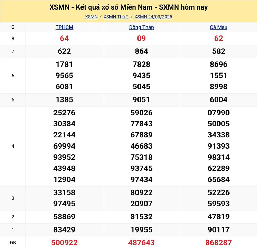 XSMN 24/3, kết quả xổ số miền Nam ngày 24/3/2025.