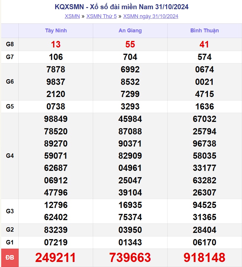 - Thứ 5 hàng tuần xổ số miền Nam được quay thưởng tại An Giang, Bình Thuận, Tây Ninh.