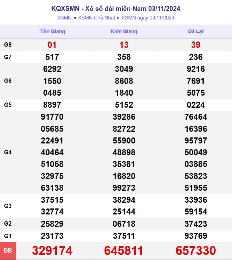 - Chủ nhật hàng tuần xổ số miền Nam được mở thưởng tại Kiên Giang, Tiền Giang, Đà Lạt.