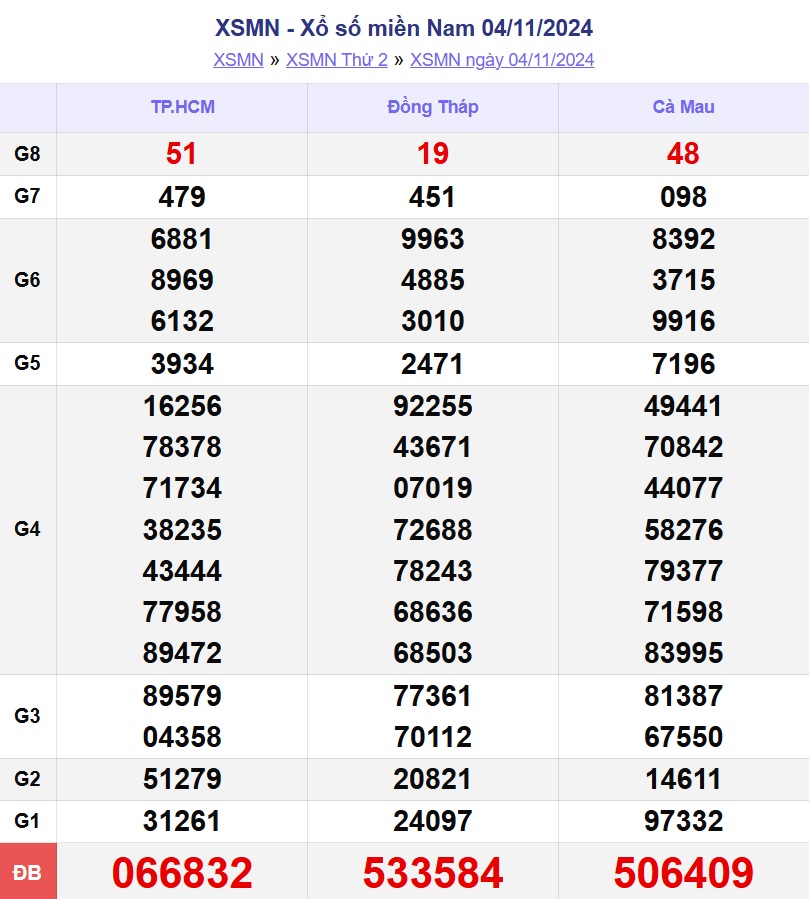 XSMN 5/11. Kết quả xổ số miền Nam hôm nay thứ Ba ngày 5/11/2024 sẽ được cập nhật trực tiếp trên LDG. Kết quả các giải thưởng của XSMN ngày 5/11/2024 được công bố lần lượt từ giải nhất cho đến giải tám, cuối cùng là giải đặc biệt.