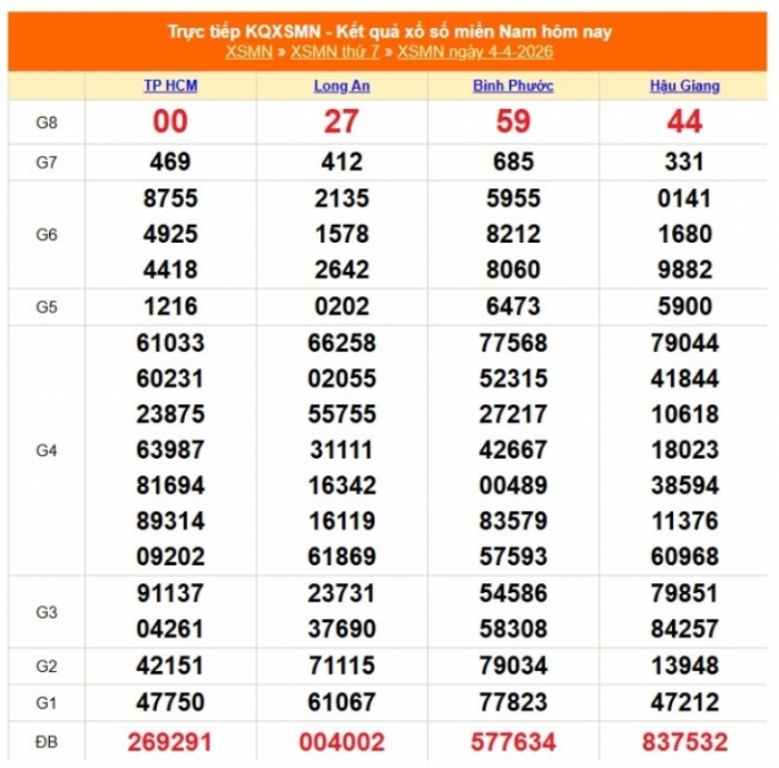 Kết quả xổ số miền Nam ngày 4/4/2026