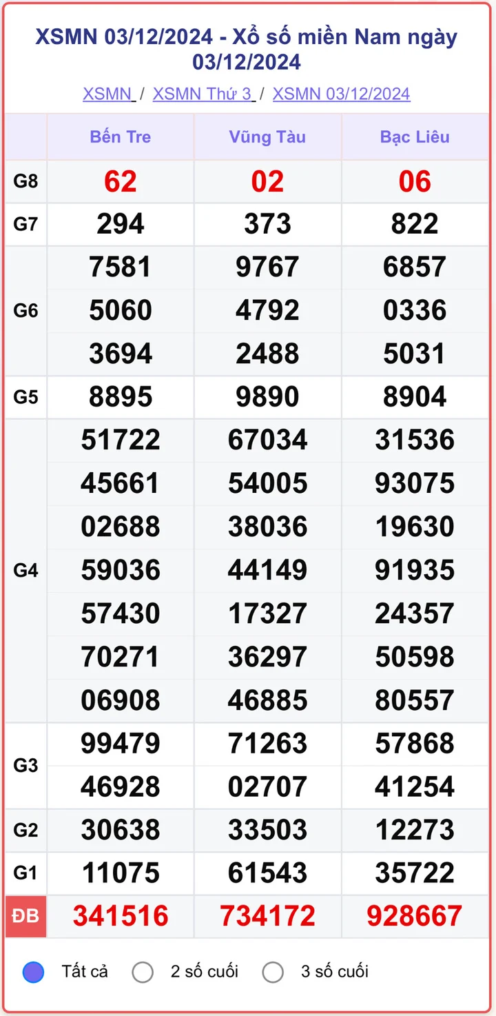 XSMN 10/12. Kết quả xổ số miền Nam hôm nay - XSMN thứ Ba ngày 10/12/2024 sẽ được cập nhật trực tiếp trên LDG. Kết quả các giải thưởng của XSMN ngày 10/12/2024 được công bố lần lượt từ giải nhất cho đến giải tám, cuối cùng là giải đặc biệt.