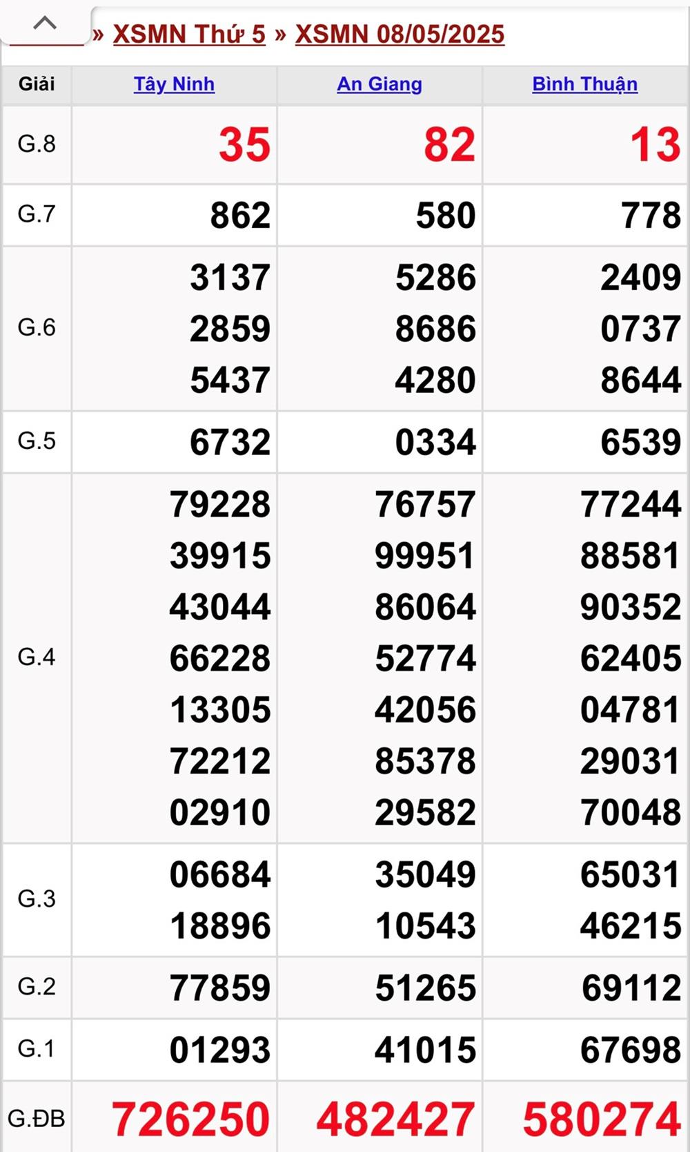 - Thứ 5 hàng tuần xổ số miền Nam được quay thưởng tại An Giang, Bình Thuận, Tây Ninh.