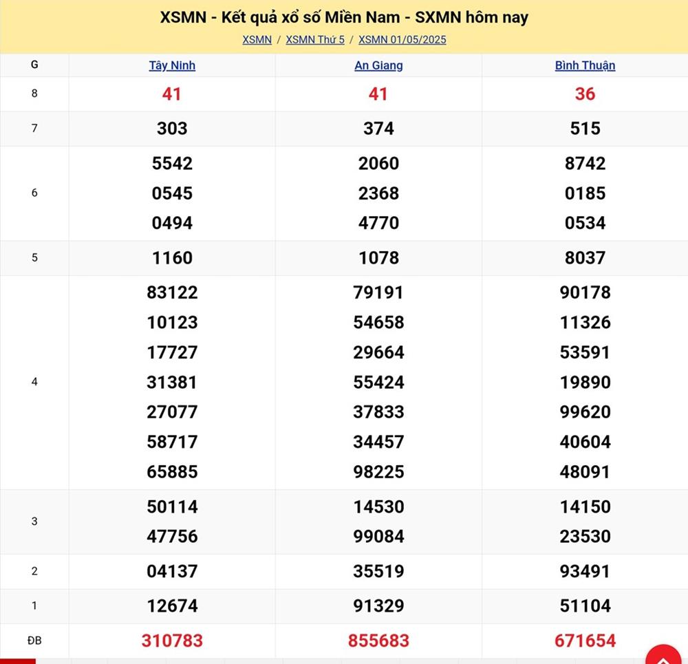 - Thứ 5 hàng tuần xổ số miền Nam được quay thưởng tại An Giang, Bình Thuận, Tây Ninh.