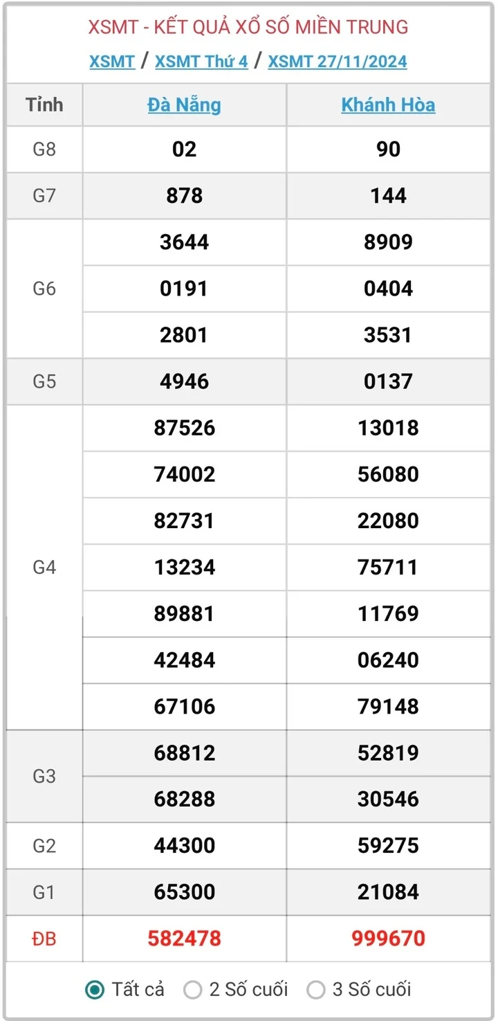 XSMT 03/12. Kết quả xổ số miền Trung hôm nay - XSMT thứ Ba ngày 03/12/2024 sẽ được cập nhật trực tiếp trên LDG. Kết quả các giải thưởng của XSMT ngày 03/12/2024 sẽ được công bố lần lượt từ giải nhất đến giải tám, cuối cùng là giải đặc biệt.