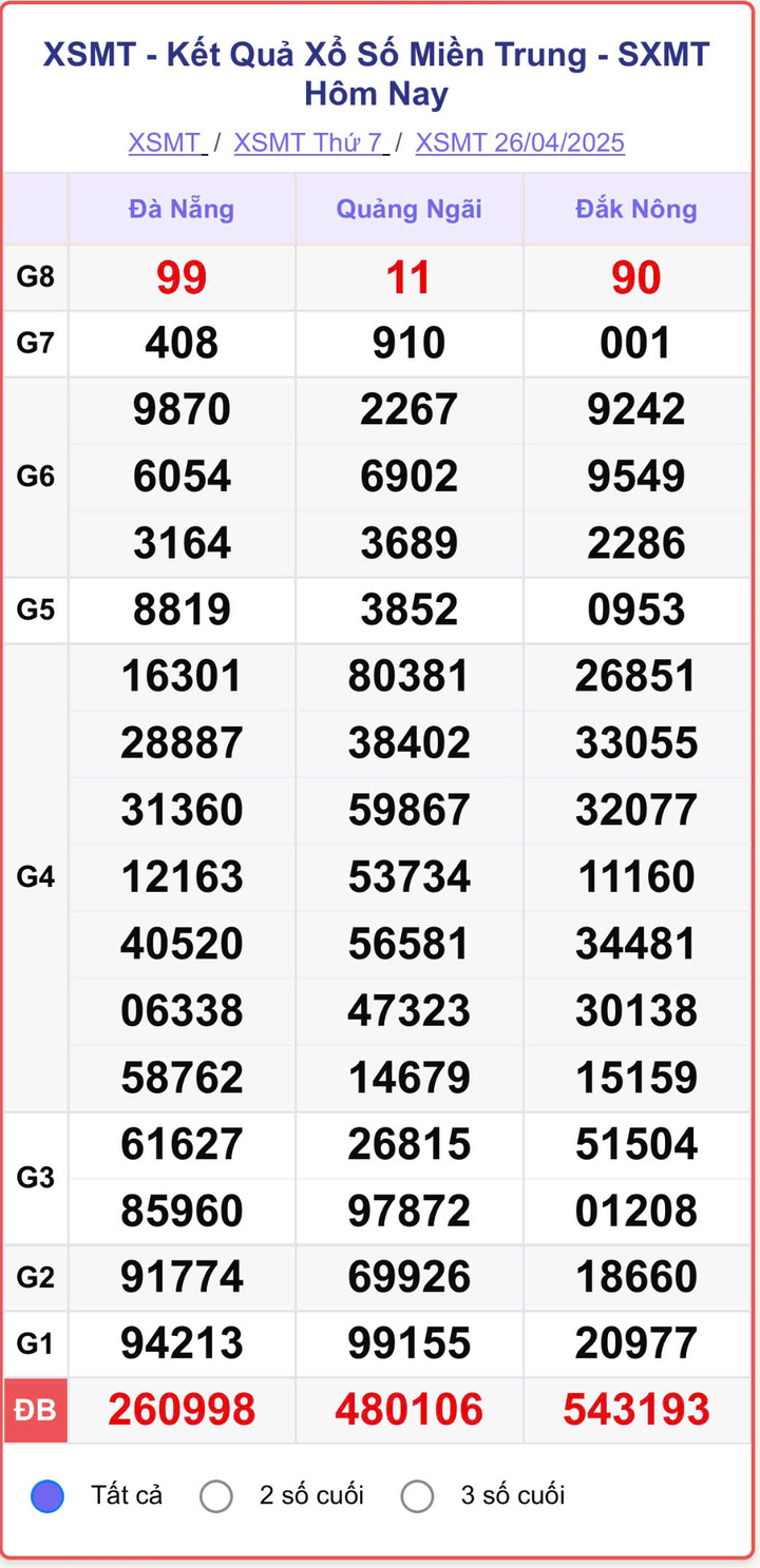 XSMT 26/4, kết quả xổ số miền Trung (KQXSMT) ngày 26/4/2025.