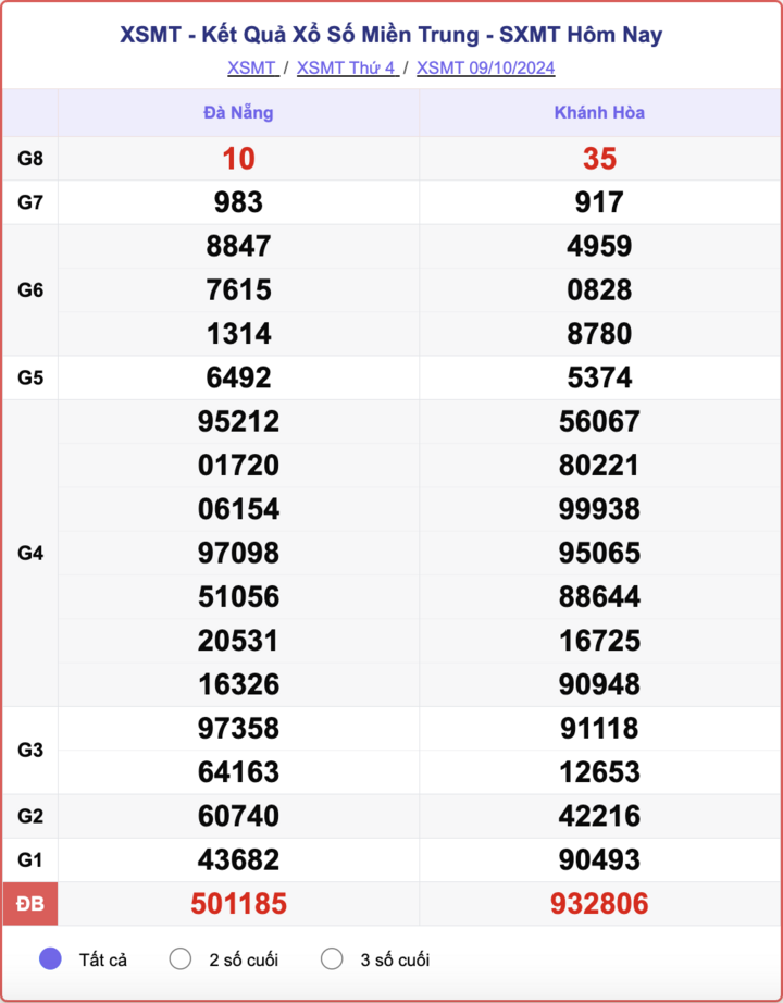 Kết quả xổ số miền Trung hôm nay - XSMT 14/10 - XSMT thứ Hai ngày 14/10/2024 sẽ được cập nhật trực tiếp nhanh chóng trên LDG. Kết quả các giải thưởng của XSMT ngày 14/10/2024 được công bố lần lượt từ giải nhất đến giải tám, cuối cùng là giải đặc biệt.