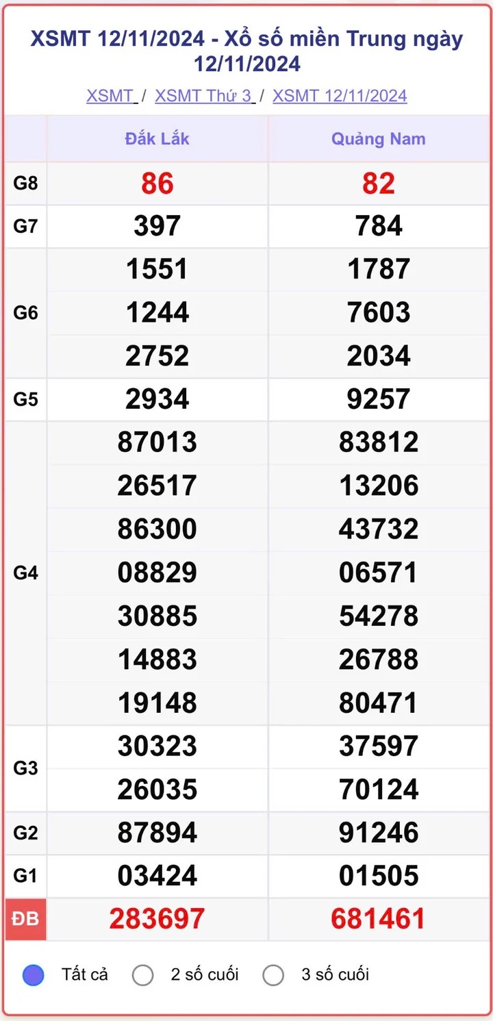XSMT 17/11. Kết quả xổ số miền Trung hôm nay - XSMT Chủ Nhật ngày 17/11/2024 sẽ được cập nhật trực tiếp trên LDG. Kết quả các giải thưởng của XSMT ngày 17/11/2024 sẽ được công bố lần lượt từ giải nhất đến giải tám, cuối cùng là giải đặc biệt.