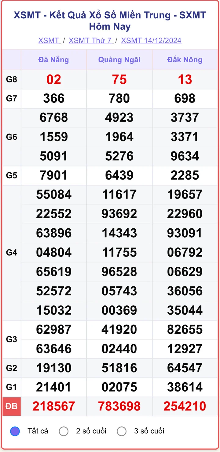 XSMT 21/12. Kết quả xổ số miền Trung hôm nay - XSMT thứ Bảy ngày 21/12/2024 sẽ được cập nhật trực tiếp trên ldg. Kết quả các giải thưởng của XSMT ngày 21/12/2024 sẽ được công bố lần lượt từ giải nhất đến giải tám, cuối cùng là giải đặc biệt.