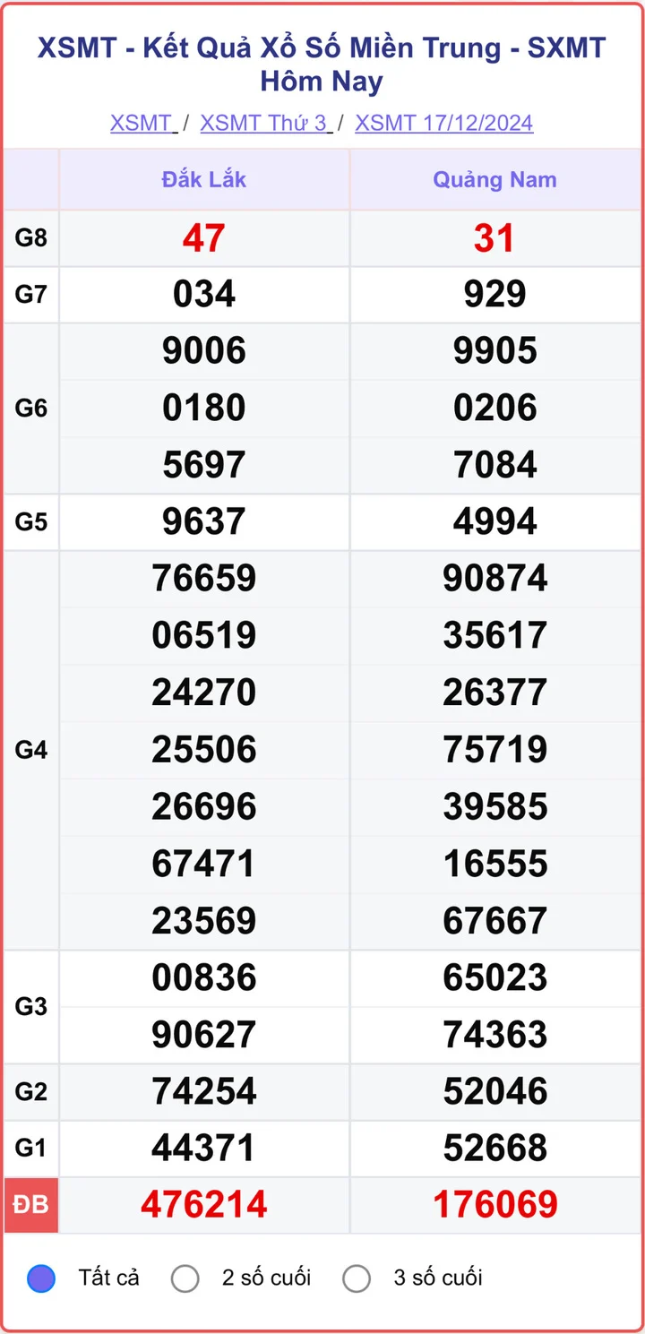 XSMT 17/12, kết quả xổ số miền Trung hôm nay 17/12/2024.
