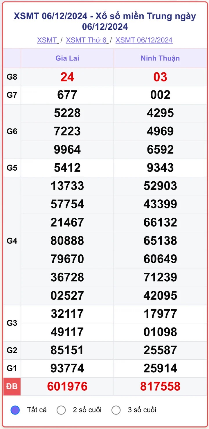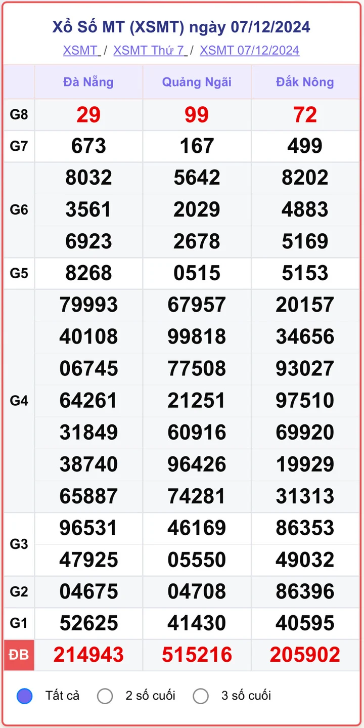 XSMT 12/12. Kết quả xổ số miền Trung hôm nay - XSMT thứ Năm ngày 12/12/2024 sẽ được cập nhật trực tiếp trên LDG. Kết quả các giải thưởng của XSMT ngày 12/12/2024 sẽ được công bố lần lượt từ giải nhất đến giải tám, cuối cùng là giải đặc biệt.