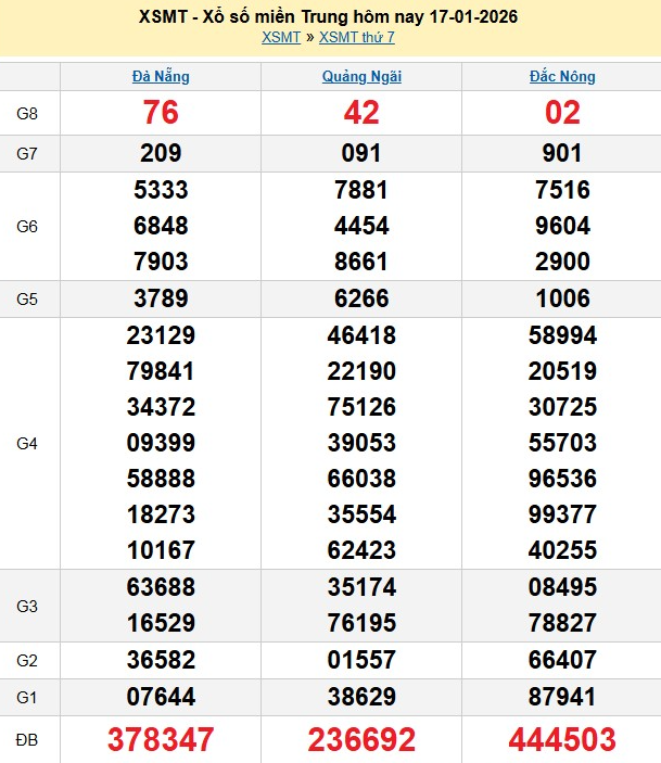 Kết quả xổ số miền Trung ngày 17/1/2026