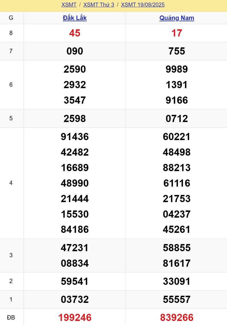 Kết quả xổ số miền Trung (XSMT) được thực hiện lúc 16 giờ 30 phút và được mở thưởng bởi Công ty xổ số kiến thiết của tỉnh Quảng Nam (XSQNA), Đắk Lắk (XSĐL). Kết quả của đài nào sẽ được mở thưởng tại trường quay của tỉnh đó. Xổ số hôm nay - KQXSMT ngày 19/8 được quay thưởng bắt đầu từ giải tám cho đến giải nhất, cuối cùng là công bố kết quả giải đặc biệt.
