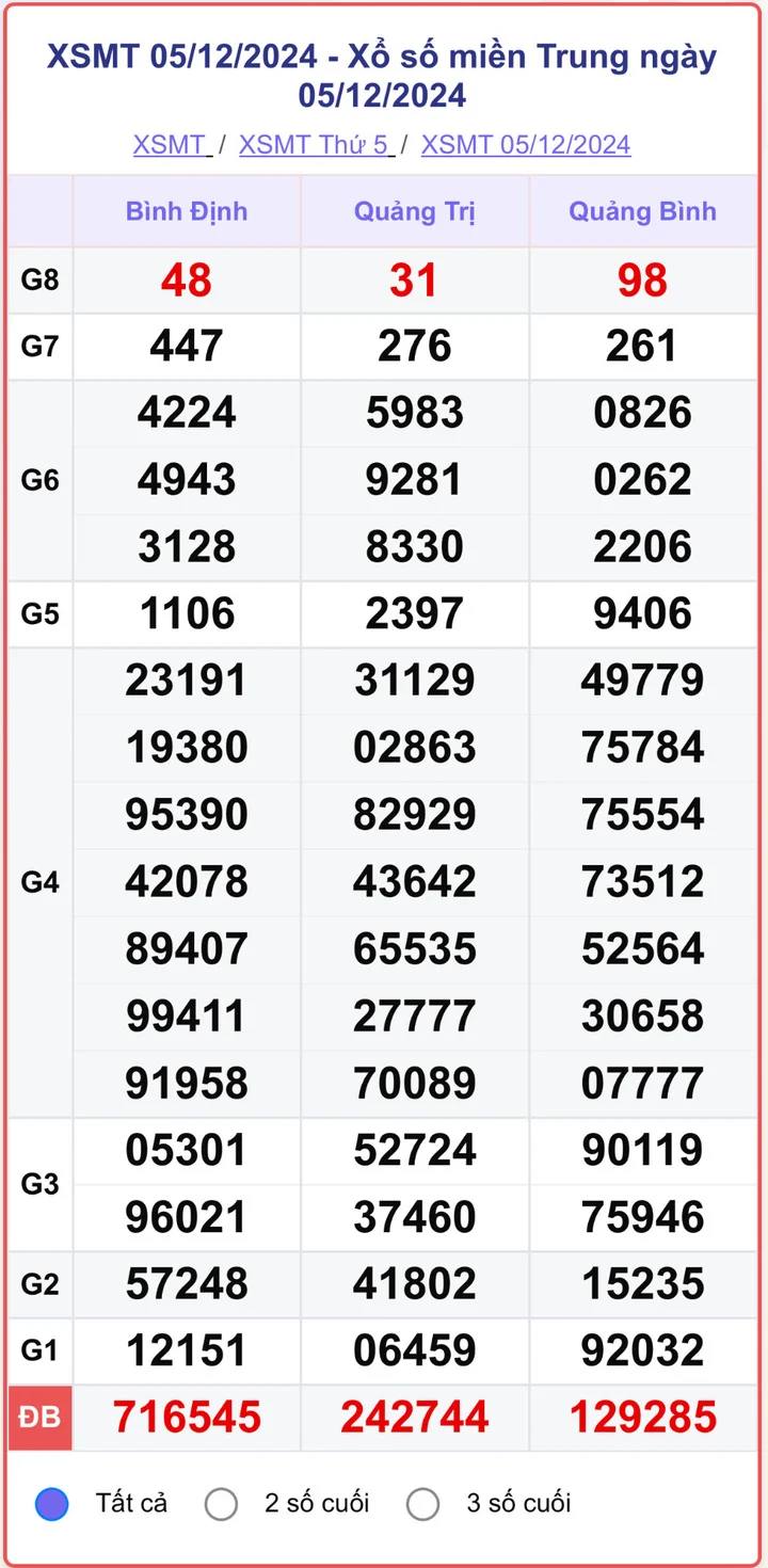 - Xổ số miền Trung thứ năm được mở thưởng tại Quảng Trị, Quảng Bình, Bình Định.