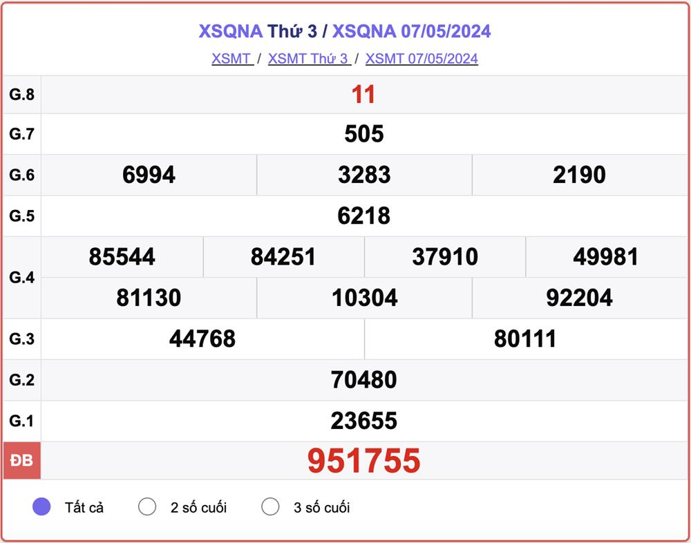 - Kết quả XSQNA ngày 7/5/2024