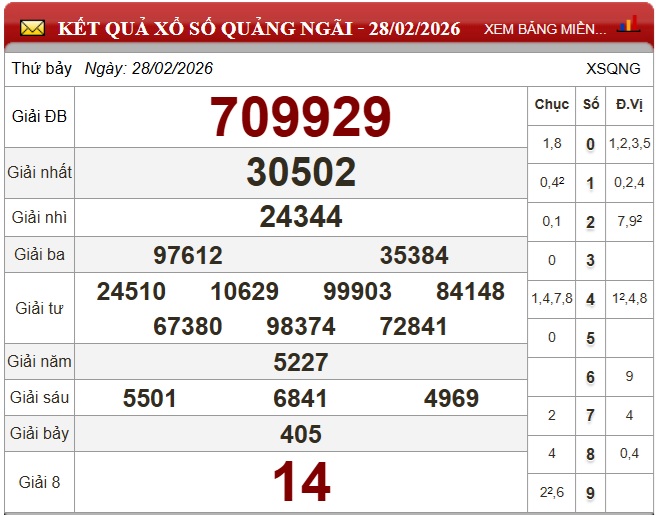 Kết quả xổ số Quảng Ngãi ngày 28/2/2026