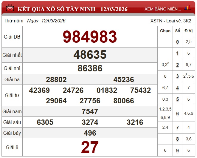 Kết quả xổ số Tây Ninh ngày 12/3/2026
