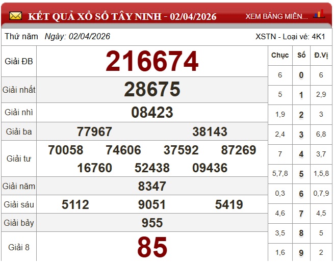 Kết quả xổ số Tây Ninh ngày 2/4/2026