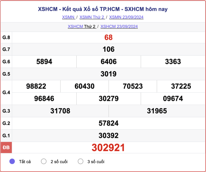 XSHCM 28/09. Kết quả xổ số TP.HCM hôm nay - XSHCM thứ Bảy ngày 28/09/2024 sẽ được cập nhật nhanh chóng và chính xác nhất trên phuongtruongan.vn. Kết quả các giải thưởng của XSHCM ngày 28/09/2024 sẽ được cập nhật liên tục từ giải nhất cho đến giải tám, cuối cùng là giải đặc biệt.