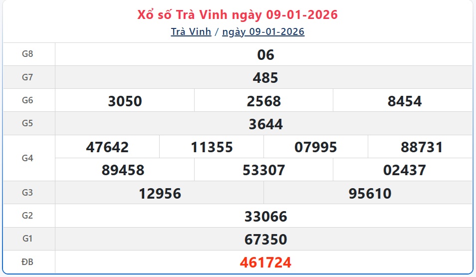 Kết quả xổ số Trà Vinh hôm nay ngày 9/1/2026 được quay vào lúc 16h15 bởi Công ty TNHH MTV Xổ số kiến thiết Trà Vinh. Kết quả các giải thưởng XSTV 9/1/2026 được công bố lần lượt từ giải nhất cho đến giải tám, cuối cùng là giải đặc biệt.