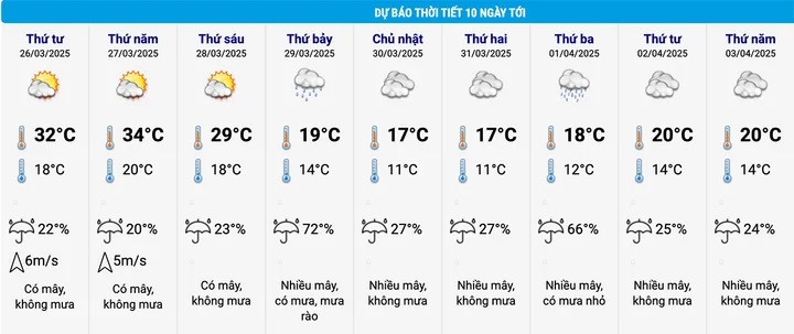 Theo đó, từ hôm nay 25/3, nhiệt độ miền Bắc nhiều nơi vượt 30°C. Từ 26-28/3, miền Bắc tăng nhiệt mạnh hơn, cảm giác oi bức rõ rệt. Nắng nóng xảy ra cục bộ ở Tây Bắc Bộ, cao nhất lên tới 35°C.