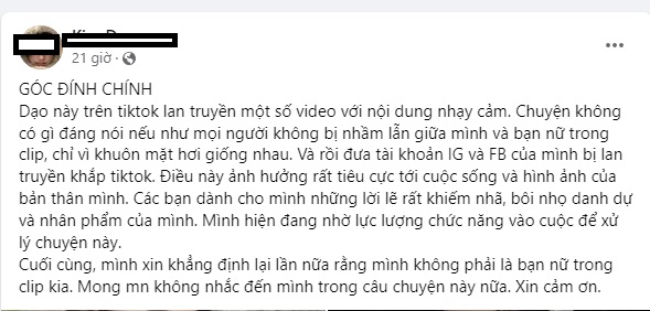 "Dạo này trên tiktok lan truyền một số video với nội dung nhạy cảm. Chuyện không có gì đáng nói nếu như mọi người không bị nhầm lẫn giữa mình và bạn nữ trong clip, chỉ vì khuôn mặt hơi giống nhau. Và rồi đưa tài khoản IG và FB của mình bị lan truyền khắp tiktok. Điều này ảnh hưởng rất tiêu cực tới cuộc sống và hình ảnh của bản thân mình.