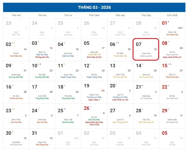 Xem lịch âm hôm nay 7/3 theo dõi âm lịch vạn niên Thứ Bảy ngày 7/3/2026 nhanh nhất và chính xác nhất.