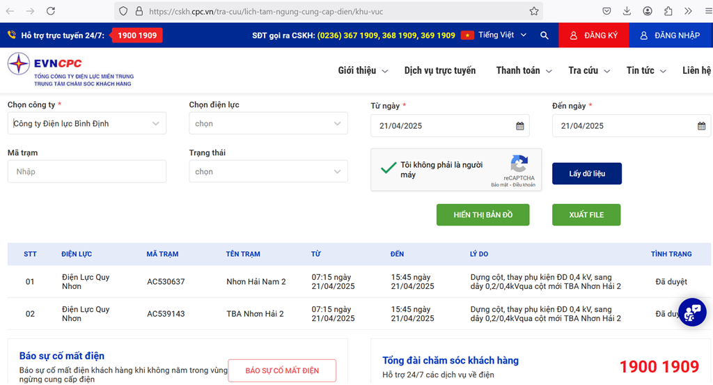 | 2 | Điện Lực Quy Nhơn | AC539143 | TBA Nhơn Hải 2 | 07:15 21/04/2025 | 15:45 21/04/2025 | Dựng cột, thay phụ kiện ĐD 0,4 kV, sang dây 0,2/0,4kVqua cột mới TBA Nhơn Hải 2 | Đã duyệt |