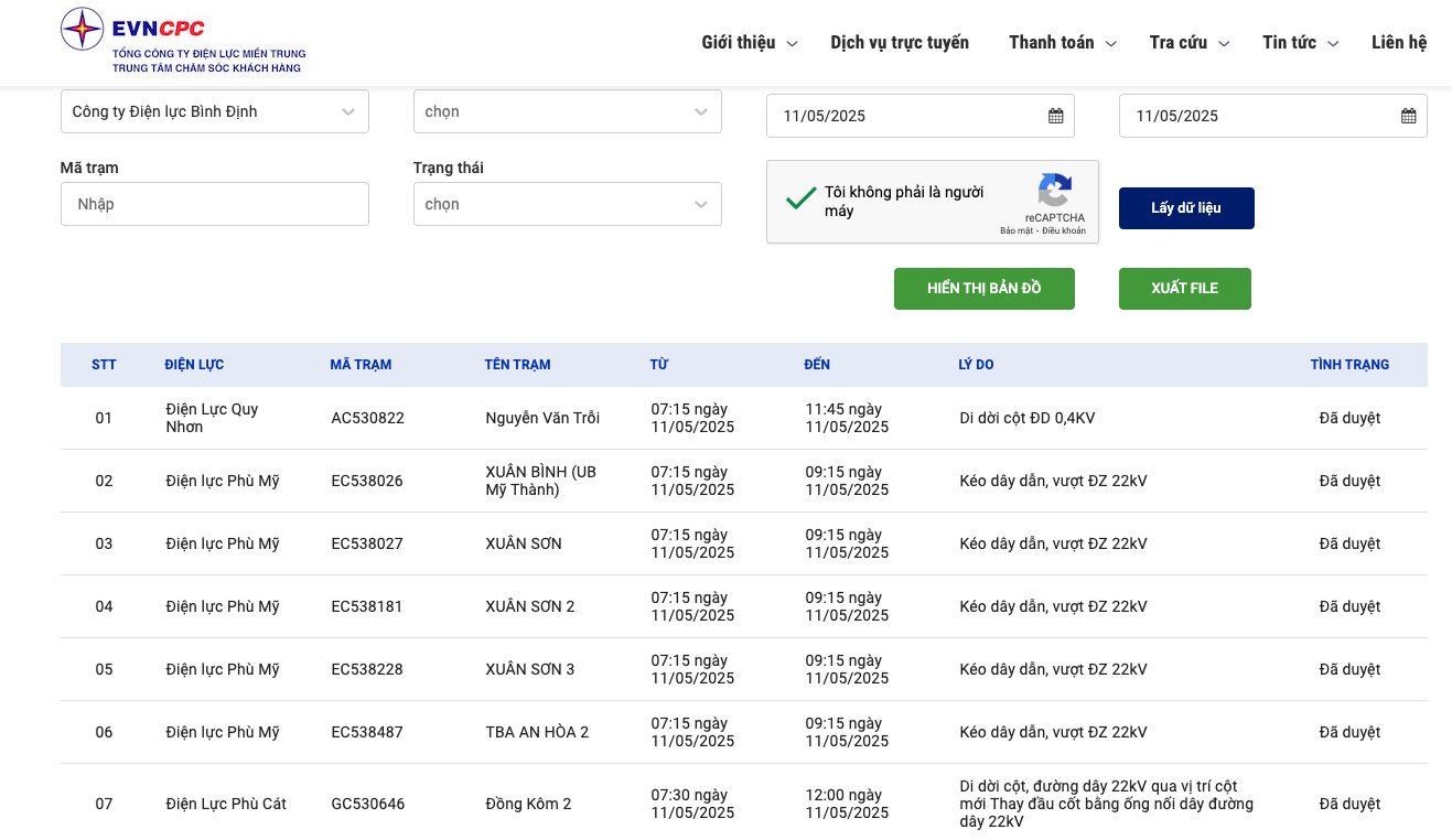 | Điện lực Phù Mỹ | EC538487 | TBA AN HÒA 2 | 07:15 11/05/2025 | 09:15 11/05/2025 | Kéo dây dẫn, vượt ĐZ 22kV | Đã duyệt |